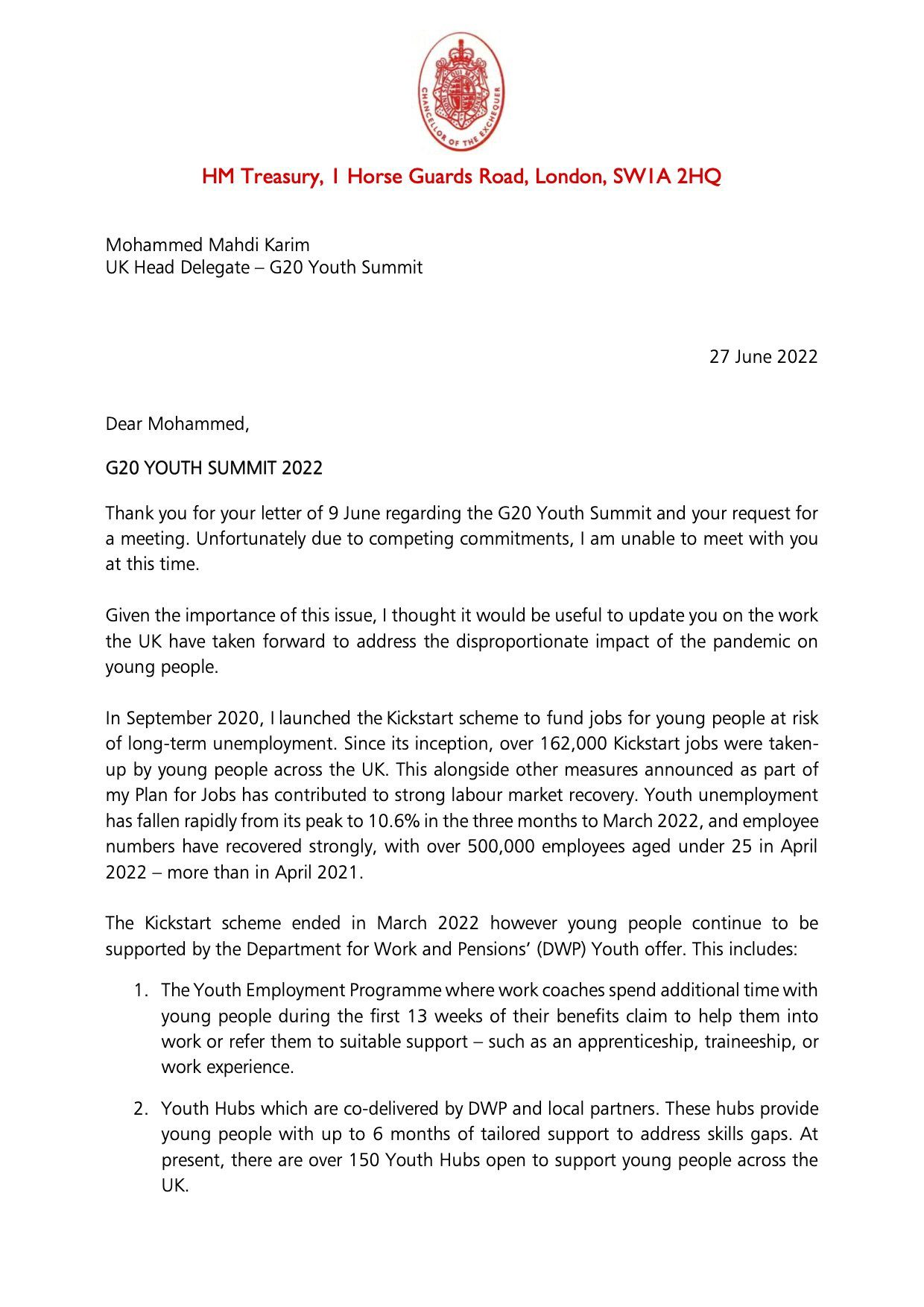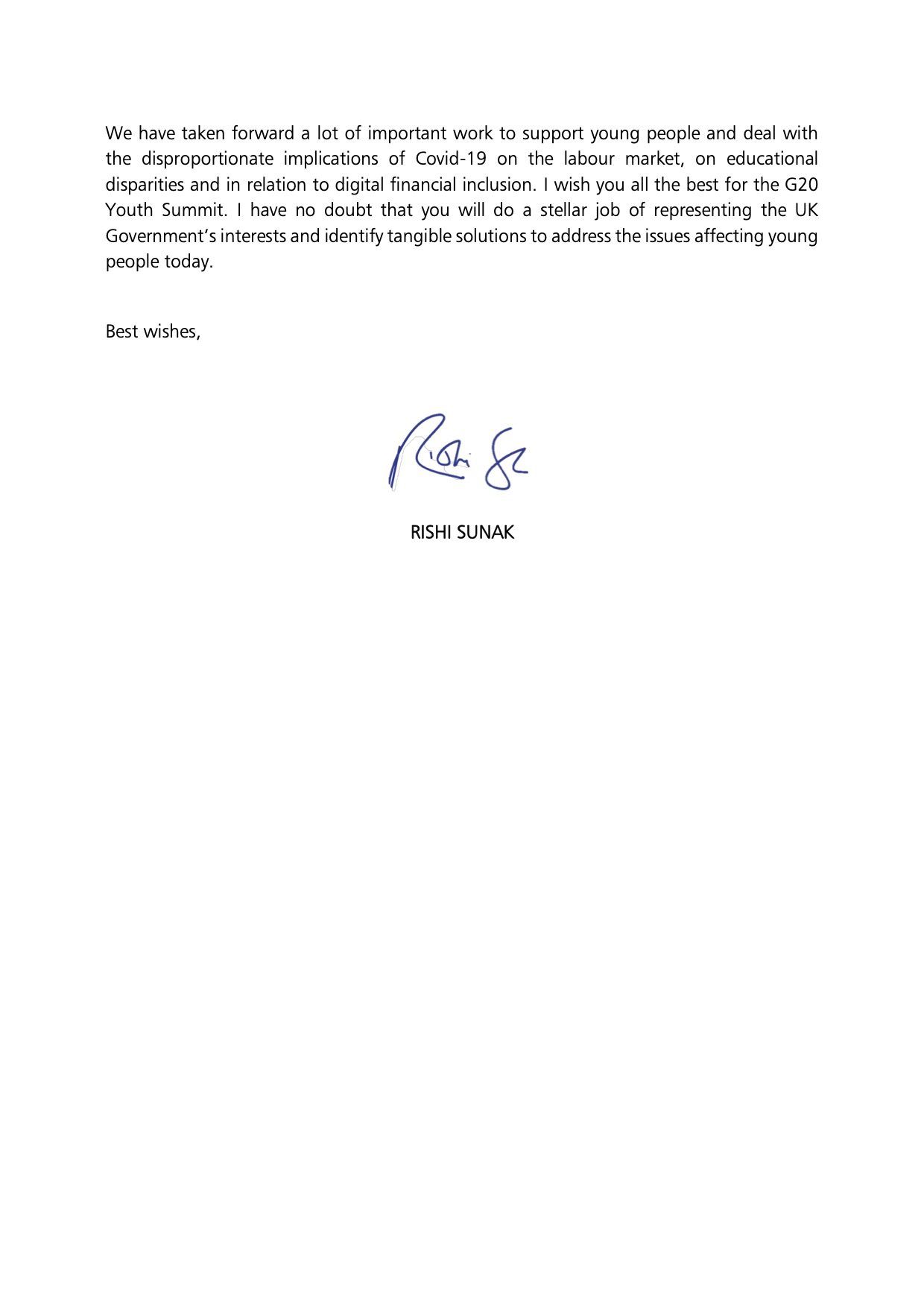 Sunak, the new Prime Minister of the United Kingdom, had previously responded to the UK Y20 representatives whilst in his former role as Chancellor of the Exchequer in June 2022.
